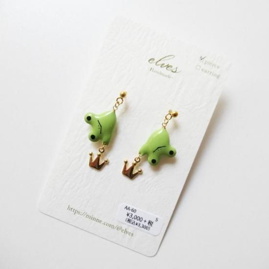 商品詳細:【金具交換可能】王冠を持った垂れたカエルの耳飾りです。